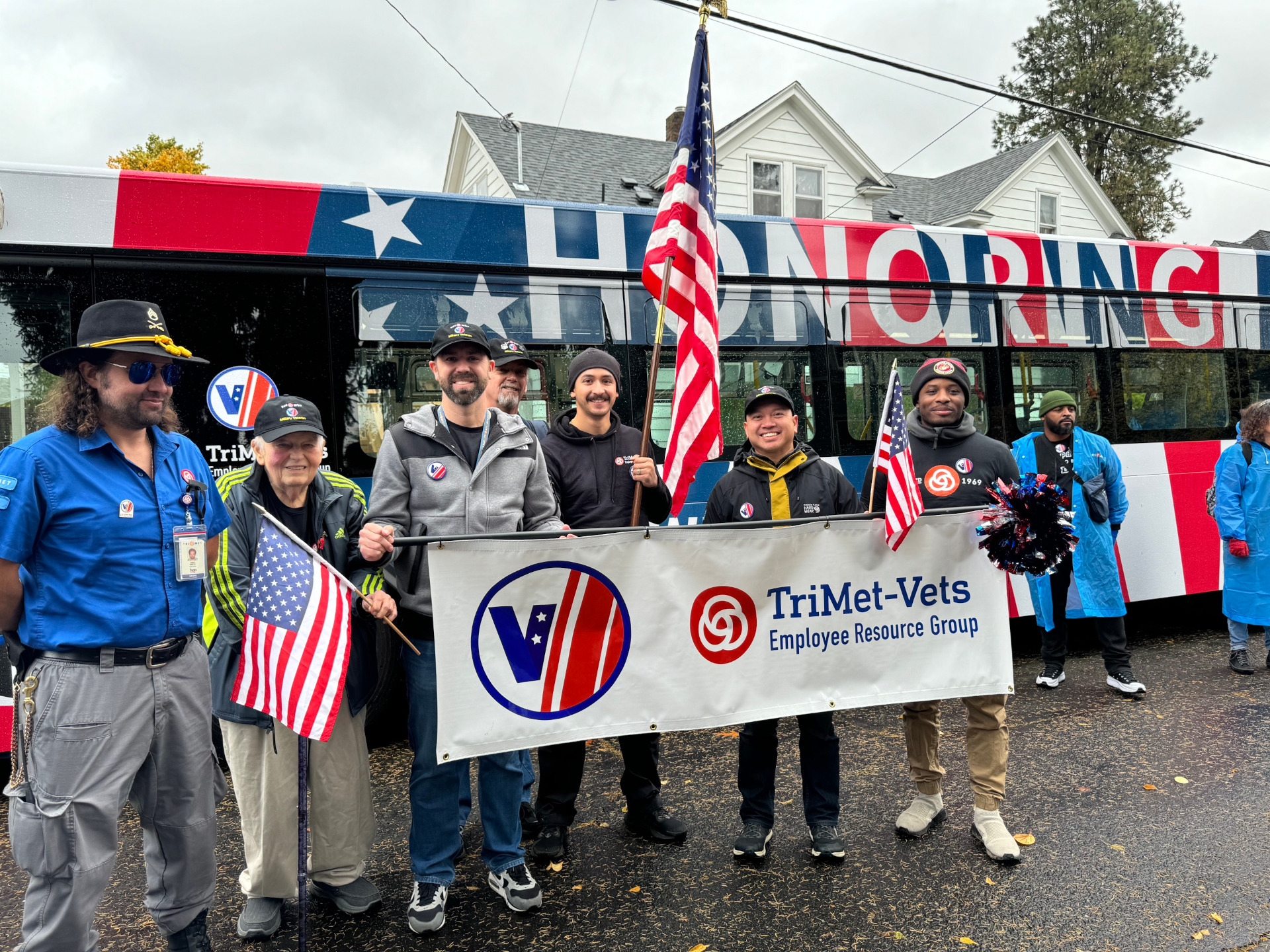 Further honoring those who have served our country, TriMet rolled out a special bus design in today’s annual Portland Veterans Day Parade, with TriMet employees who have served proudly joining as well. The bus design was created by TriMet Graphic Designer and Navy veteran Preston Covey.