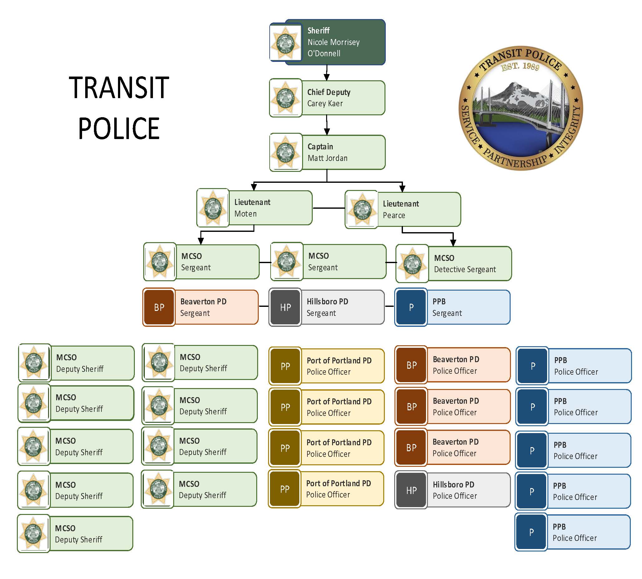 Riders should remember that 911 is always their best resource in an emergency. TriMet’s Transit Police is made up of officers from across our service area, operating as one unit under the oversight of the Multnomah County Sheriff’s Office.
